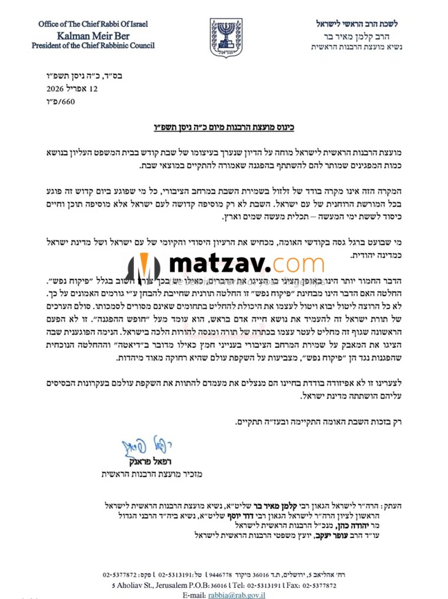 The complaint followed a sharply worded statement of protest against the Shabbos ruling by the Rabbanut, which convened this past Sunday for a special session to address the issue.