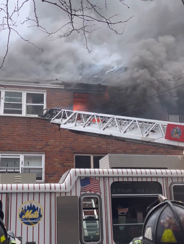 The fire broke out shortly before 12:30 p.m. on College Point Boulevard between Avery and Pople avenues. Part of the building collapsed, forcing crews to continue their efforts from outside while working to prevent the flames from spreading to neighboring homes.