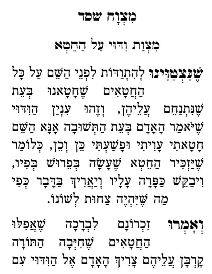 The choleh confesses his sins in thought, speech, and deed (machshavah, dibur, u’maaseh), asking for complete forgiveness and atonement. He specifically asks that his illness — or if it comes to it, his death — serve as a kapparah for all his transgressions.