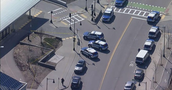 Video posted online showed more than a dozen police vehicles and at least two ambulances outside the station. Officers could be seen standing behind yellow police tape cordoning off a wide area outside the station entrance.