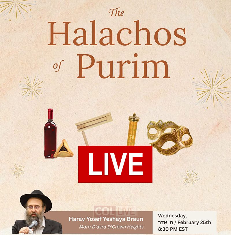 COLliveTonight! Wednesday, Rabbi Yosef Braun of the Crown Heights Beis Din will teach the Halachos of Purim.