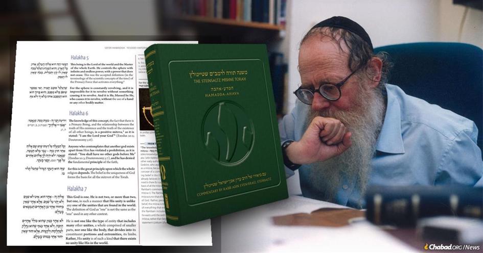 An extract from the first chapter of the Mishneh Torah, as presented in the new edition. It features the commentary of Rabbi Adin, insights from the Rebbe, and notes and images providing additional context.