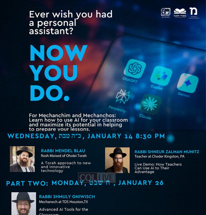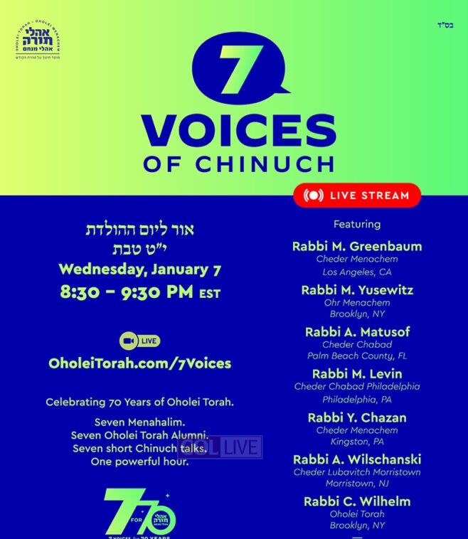 COLliveLive Wednesday night at 8:30 PM ET: Oholei Torah will host 7 Voices of Chinuch, a special live streamed program bringing together seven distinguished mechanchim for an evening of thoughtful conversation and inspiration. Full Story