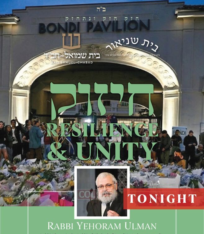 COLliveTonight: Rabbi Yehoram Ulman, father in law of Rabbi Eli Schlanger HYD, who was murdered in the Bondi Chanukah massacre, and leader of the Bondi Chabad community, will speak at an evening of Chizuk in Crown Heights. Full Story