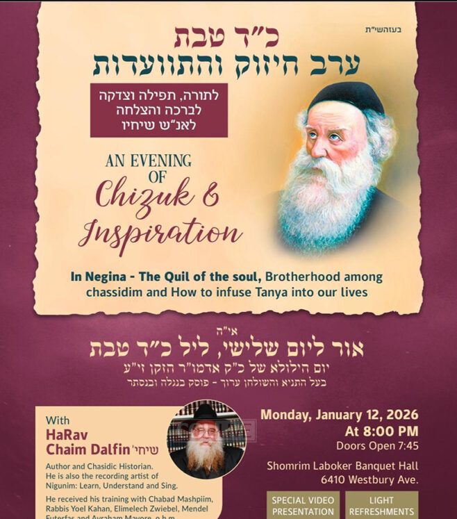 COLliveIn honor of the 15th Yartzeit of legendary Mashpia of Montreal, Rabbi Menachem Zev Greenglass, and in conjunction with the auspicious Hilloula of the Alter Rebbe on the 24th of Teves, a special evening of chizuk and inspiration will take place in Montreal. Full Story