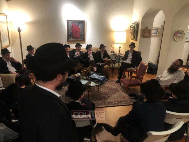 COLliveDovid Taub, creator of Itche Kadoozie, Parsha Rabbit Hole, Parsha Almanac, and more, speaks with bochurim from Chicago Mesivta after shachris at the shiva for his mother, Rivkah Taub obm. Photos