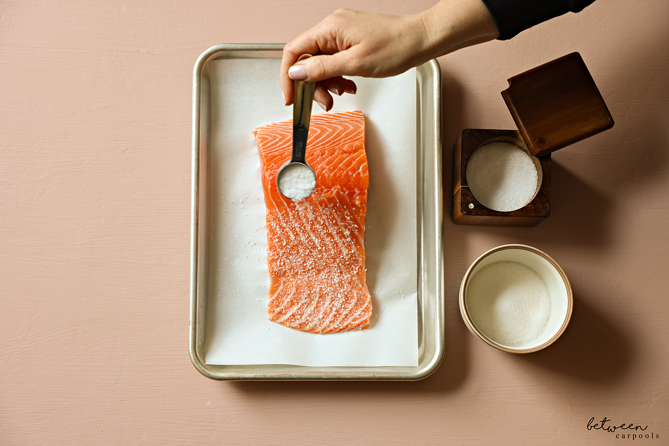 - Place the salmon in a Ziploc bag with the salt and the sugar. Toss it around to coat and refrigerate overnight to cure.