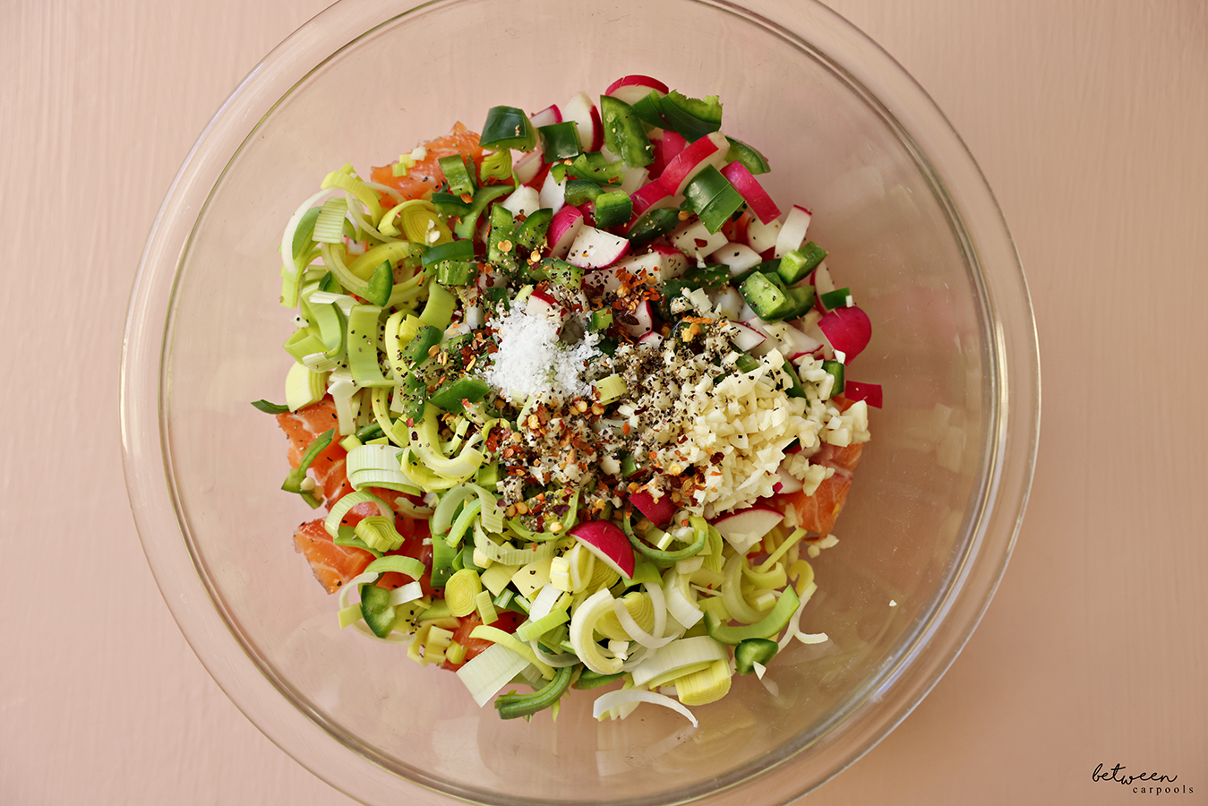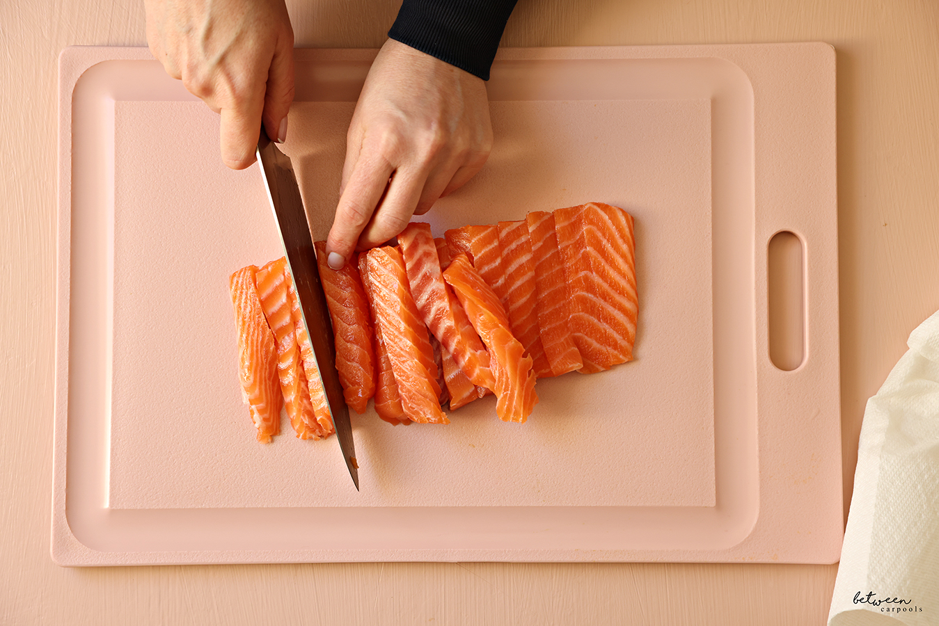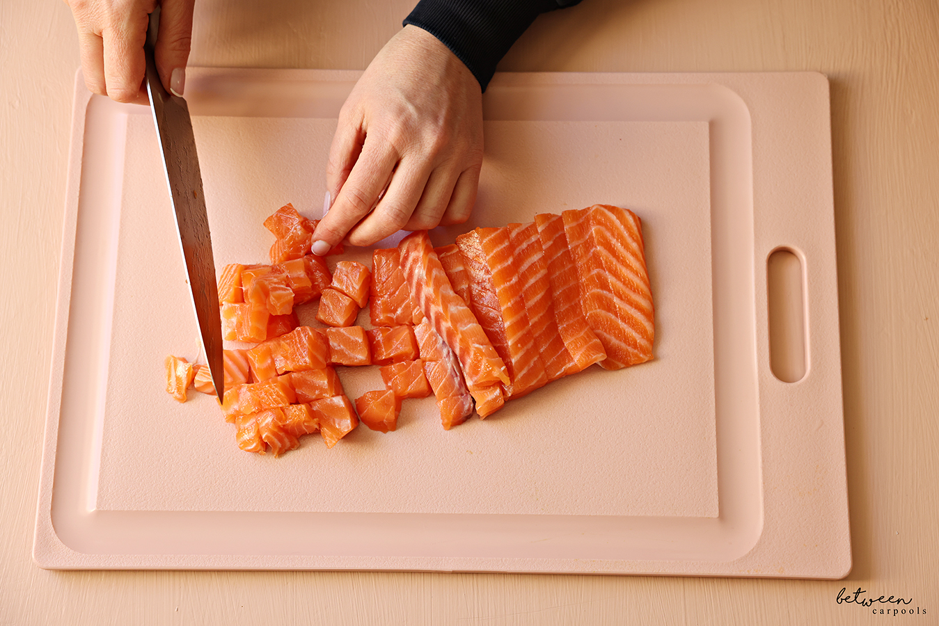 - 1 lb sushi grade salmon (salmon that is ok for eating raw), skin removed