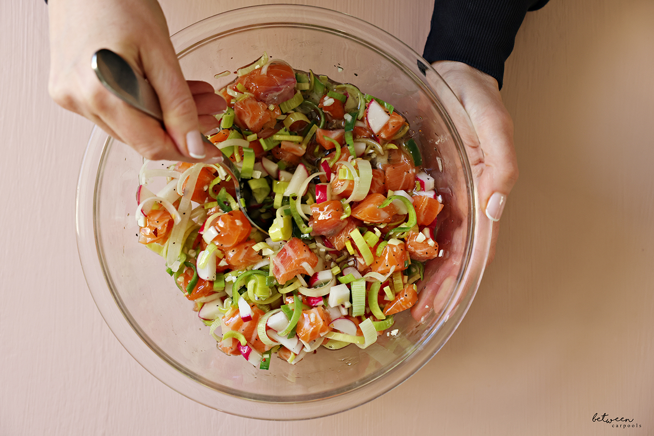 - Dice the fish into small pieces. Add to a mixing bowl along with the radishes, jalapeno, leek, garlic, and spices. Start with ½ teaspoon salt and taste to see if you want more. Cover with the oil and mix. Transfer the fish to a container and refrigerate until ready to serve.