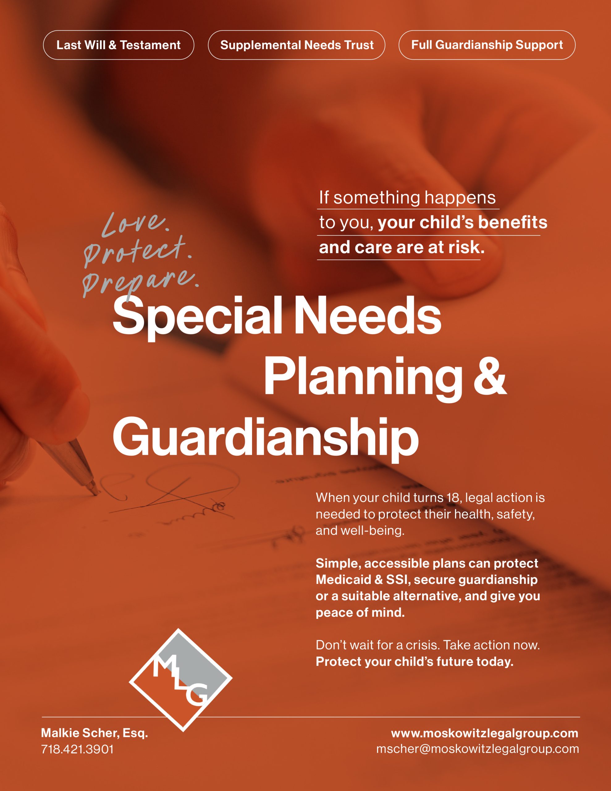 ‘That’s exactly what I help families avoid,’ explains Malkie Scher, an attorney at Moskowitz Legal Group. Malkie heads the firm’s special needs planning and guardianship department, where her focus is helping families plan ahead, before crisis hits.