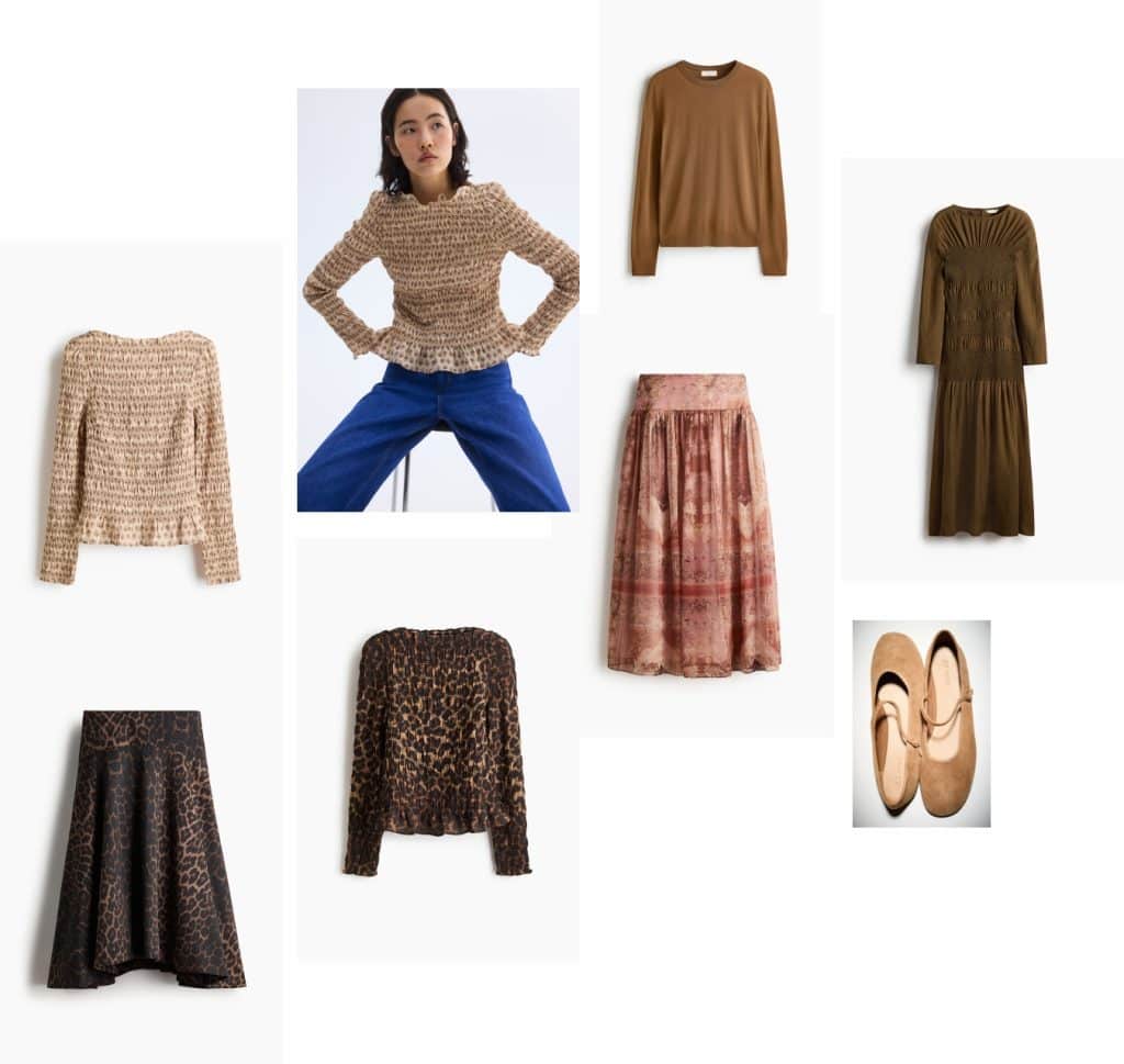 Ruched Floral Blouse | Leaopard Skirt | Leopard Top | Pink Printed Skirt | Tan Merino Wool Sweater | Smocked Dress | Suede Mary Jane Flats