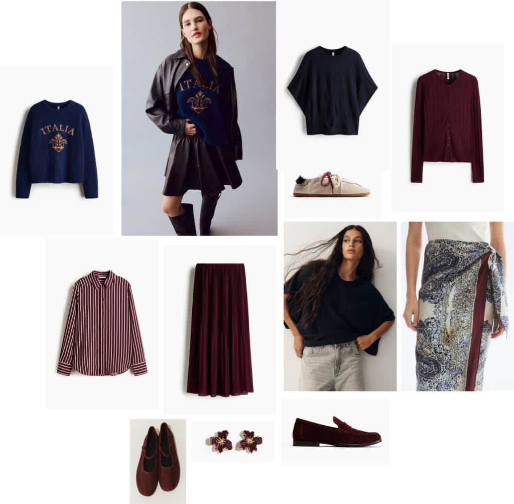 Italia Sweater | Burgundy Striped Shirt | Pleated Skirt | Suede Shoes | Earrings | Sneakers | Batwing Sleeve Knit Top | Sueded Loafers | Pointelle Burgundy Cardigan | Wrap Paisley Skirt