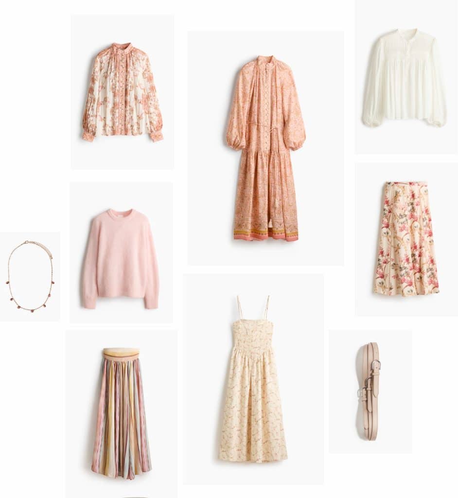 Necklace | Printed Crinkled Blouse | Pink Sweater | Striped Dress-Skirt | Pink Floral Dress | Cream Floral Jumper | Triple Belt | White Blouse | Printed Skirt