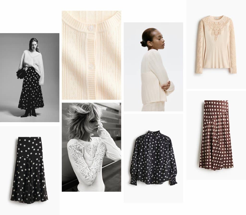 Polka Dot Skirt | Pointelle Sweater | Lace Detail Sweater | Pollka Dot Blouse | Brown Dot Skirt