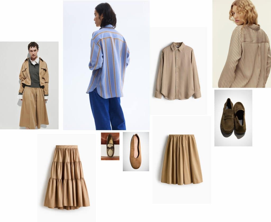 Pull Twill Skirt | Tiered Skirt | Striped Blue Shirt | Bow Loafer | Suede Flat | Striped Tan Shirt | Suede Loafer