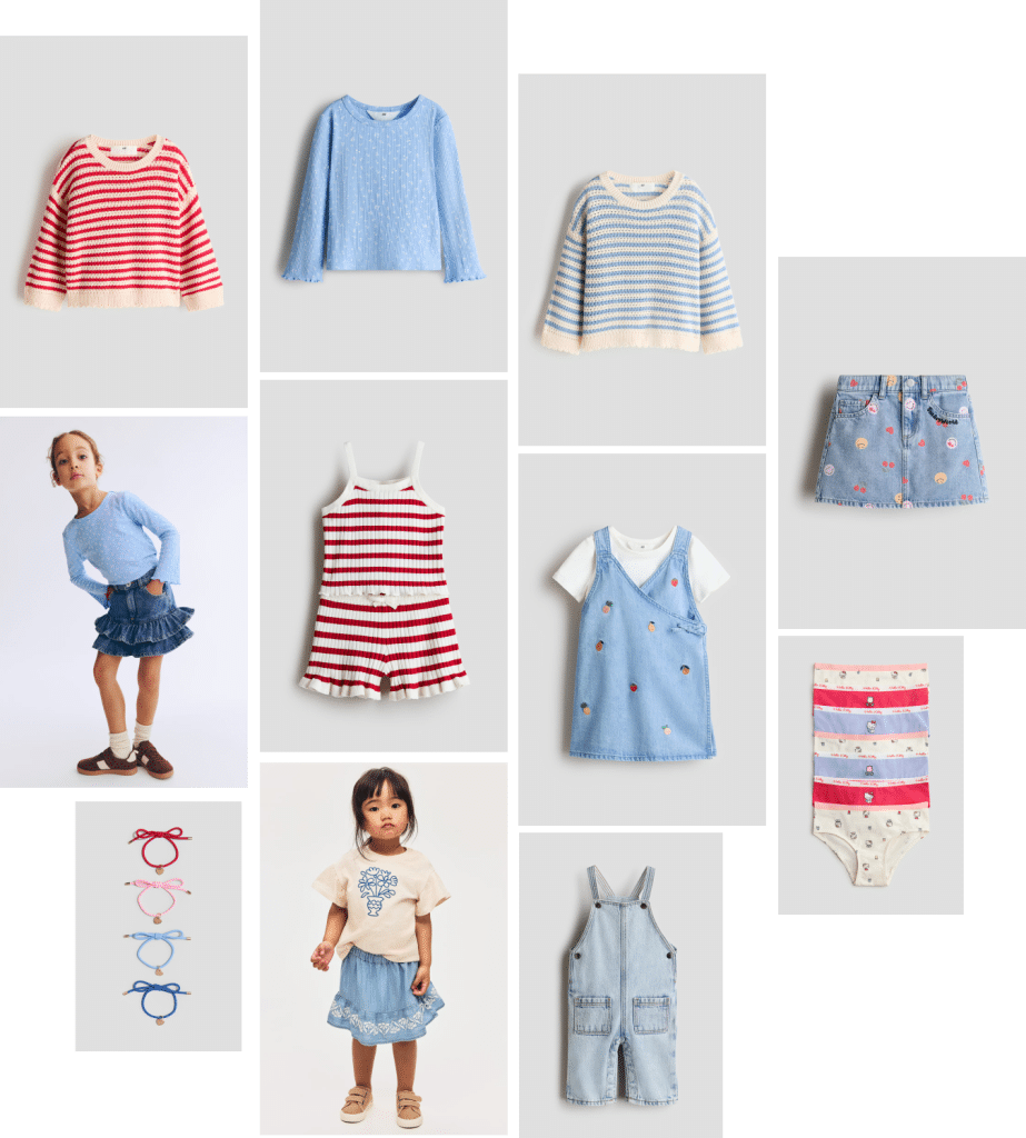 Striped Red Sweaters | Blue Ribbed Tee | Hair Ties | Striped Red Set | Smiley Denim Skirt | Blue Stripe Sweater | 2-Peice Denim Embroider Dress | Denim Overalls | Embroidered Denim Skirt | Hello Kitty Briefs