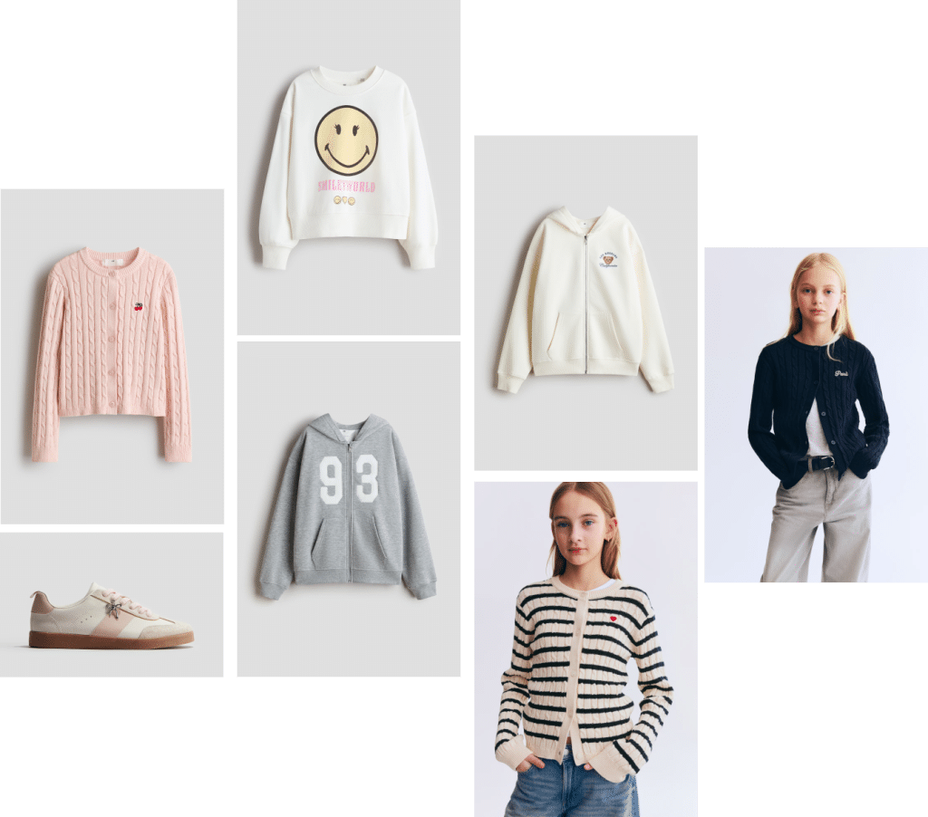 Pink Cabel-Knit Sweater | Sneakers | Smiley World Sweatshirt | Gray Hooded Sweatshirt | White Bear Sweatshirt | Navy Striped Cardigan | Navy Paris Cable Cardigan