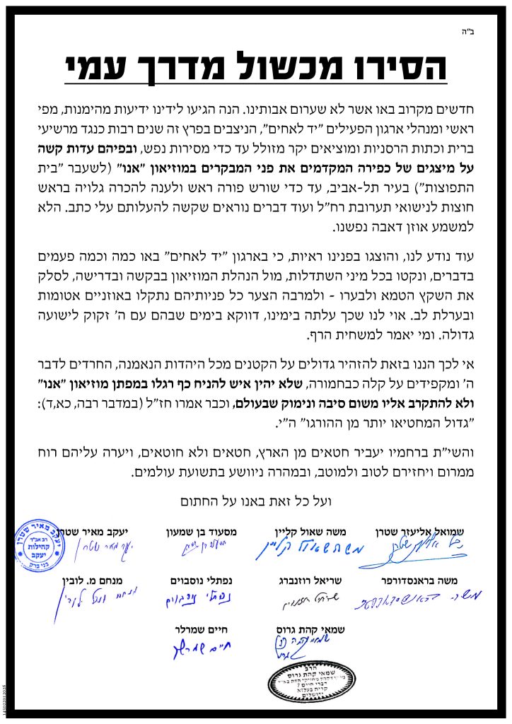 In a public proclamation titled “Remove the Obstacle from the Path of My People,” leading rabbinic authorities from across the religious spectrum urged observant Jews not to visit the museum. The statement followed appeals by the Orthodox outreach organization Yad La’Achim, which said it had repeatedly asked museum officials to remove exhibits it considers offensive and spiritually harmful.