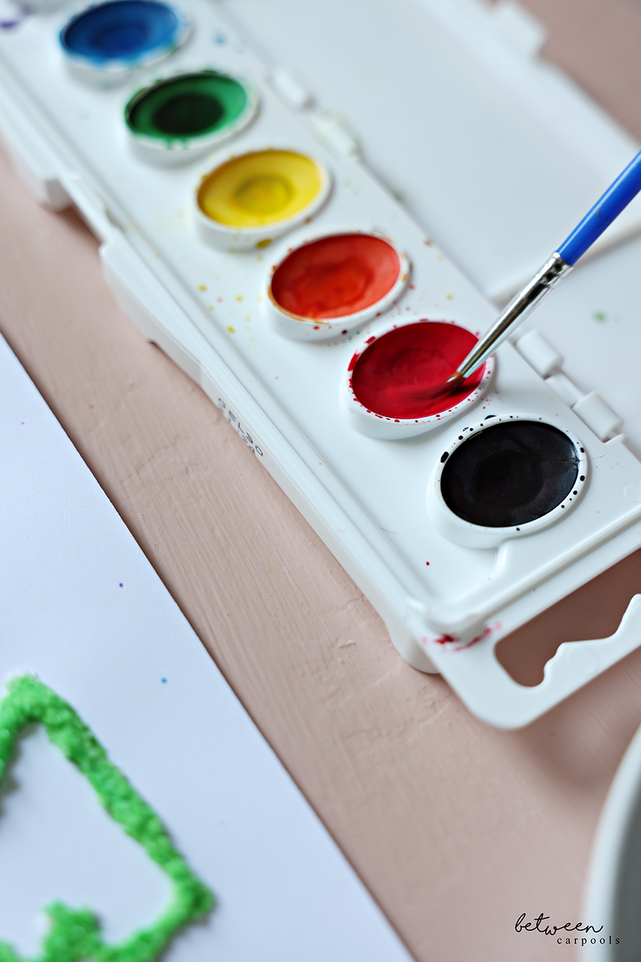Dilute a bit of watercolor paint in plastic bowls of water. It’s best to use a separate paintbrush for each color.