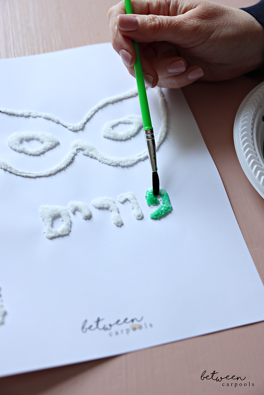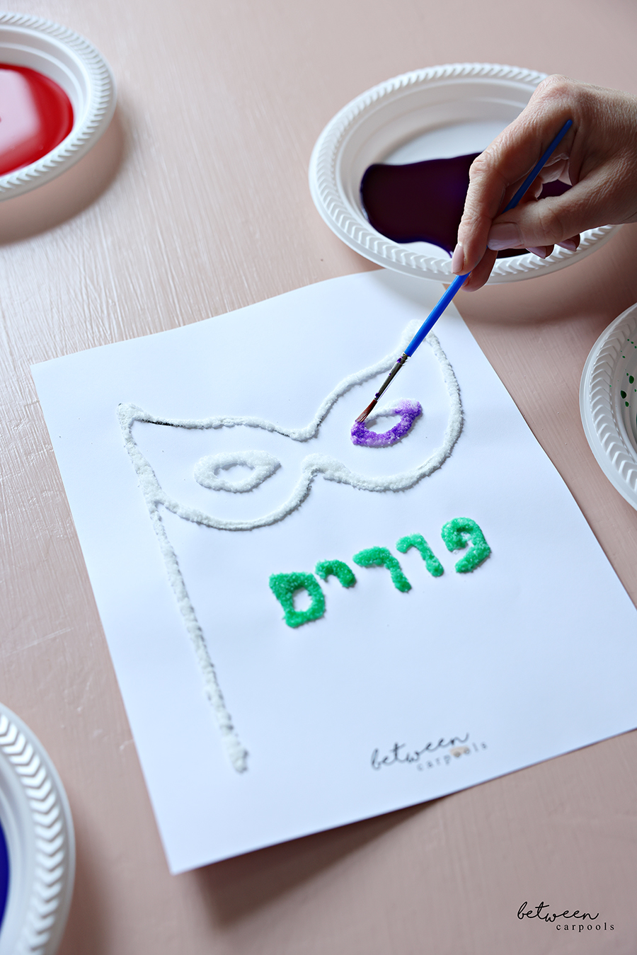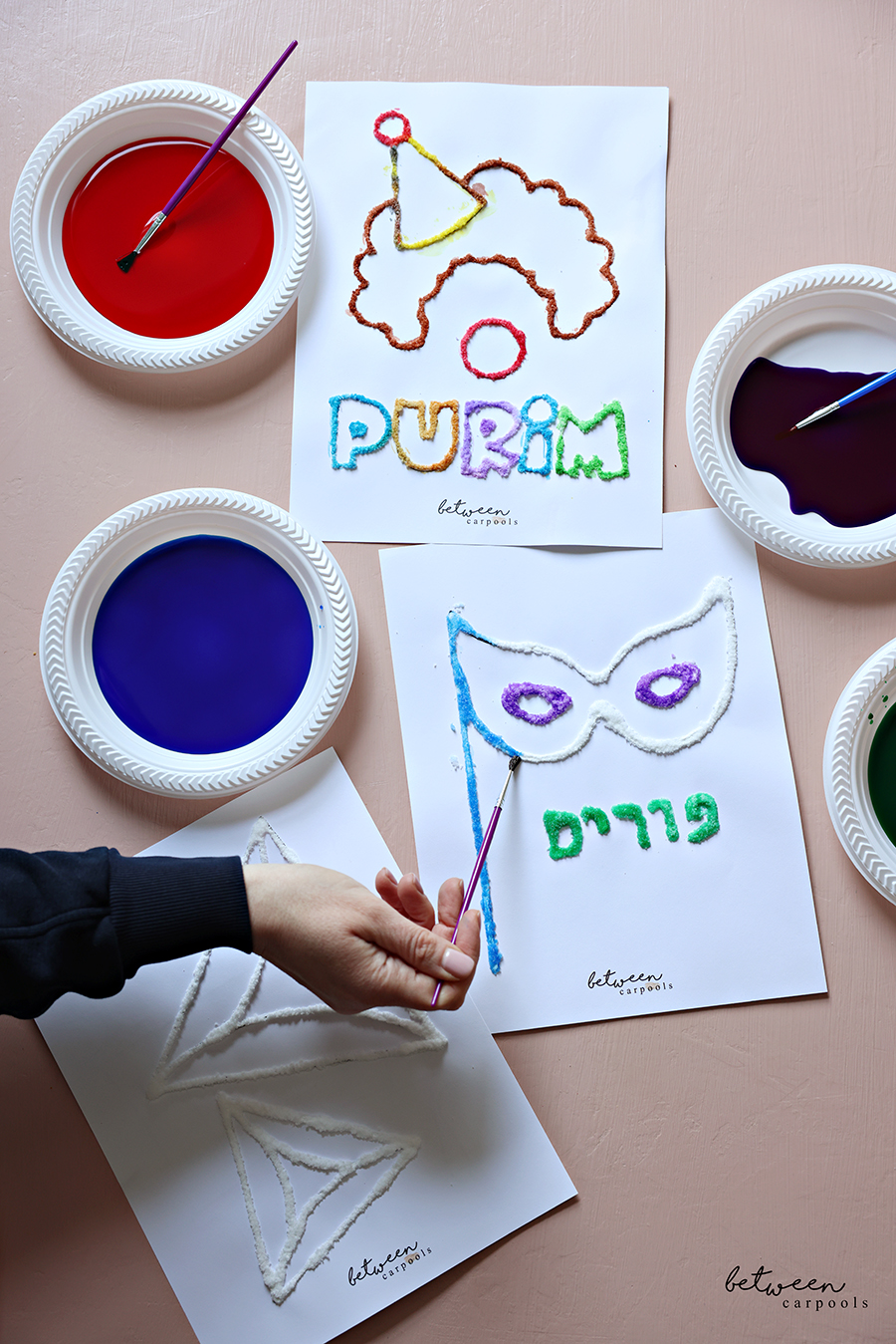 Last year, we featured this fun and satisfying Watercolor Painting Craft featuring salt and glue before Chanukah. Now, we bring you a Purim version!