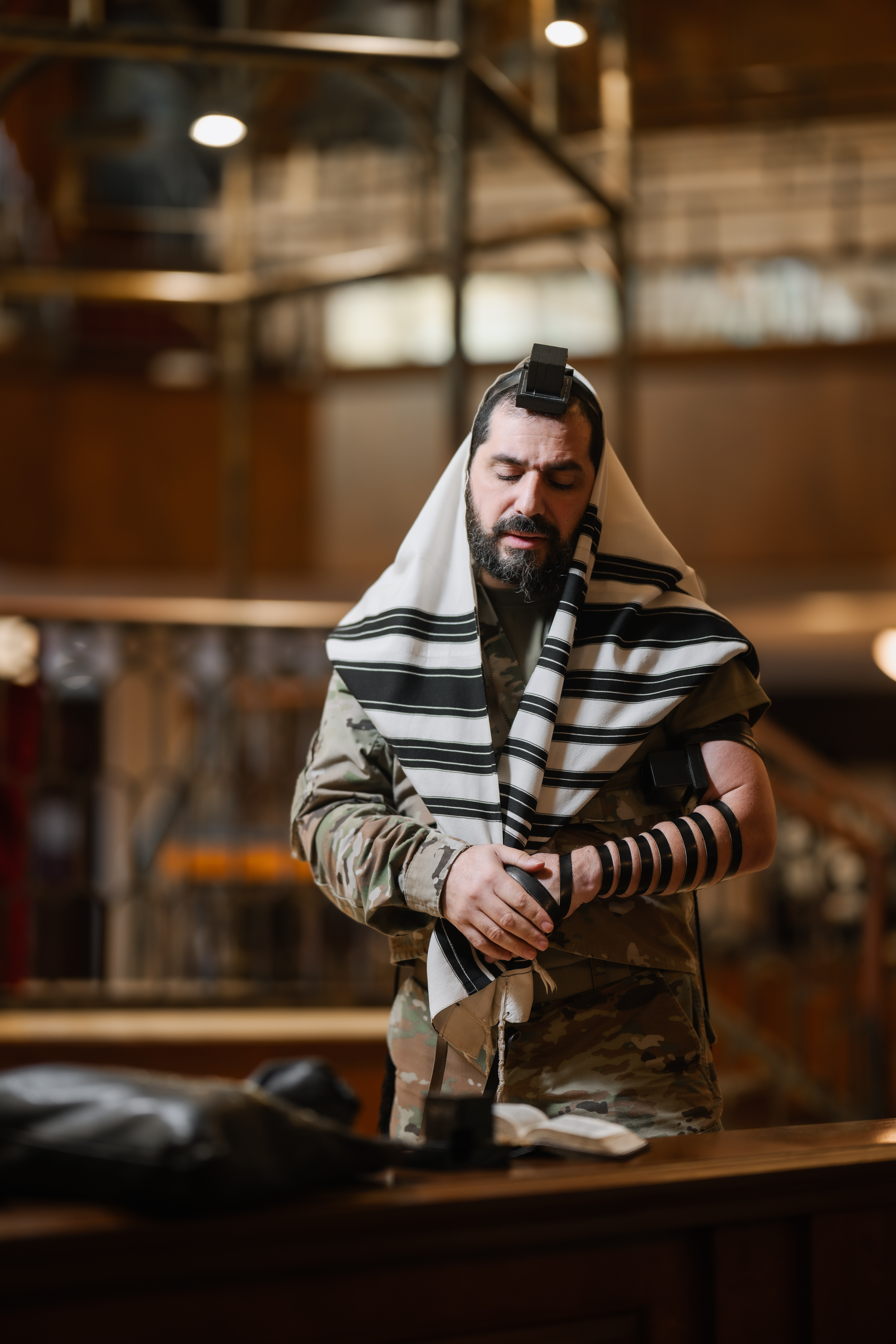 During the symposium, Harold Terens, a former U.S. Army Air Corps serviceman who fought in Normandy and the North Africa Campaign, participated in a Bar Mitzvah ceremony, putting on tefillin and being called up to the Torah for an aliyah.