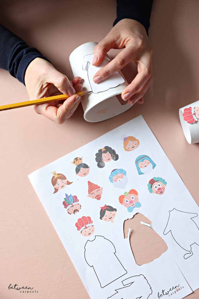 Start by downloading this sheet of Purim faces and outift shapes. Choose one of the outfit shapes and cut it out, then trace it onto the cup. The cup is going to be used upside down, so the narrow part of the cup is the top.