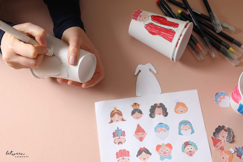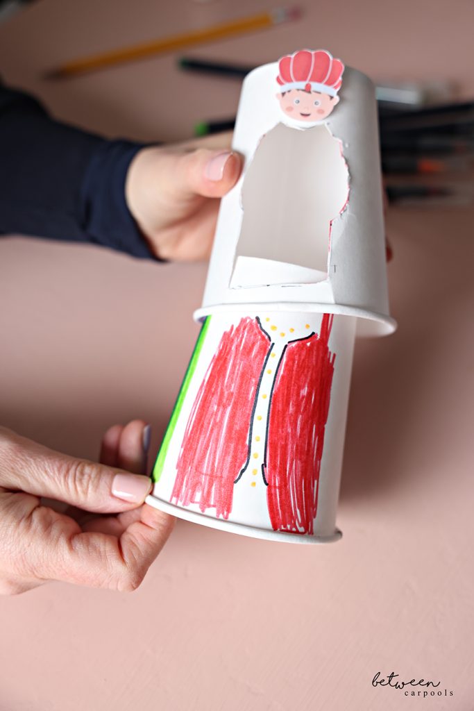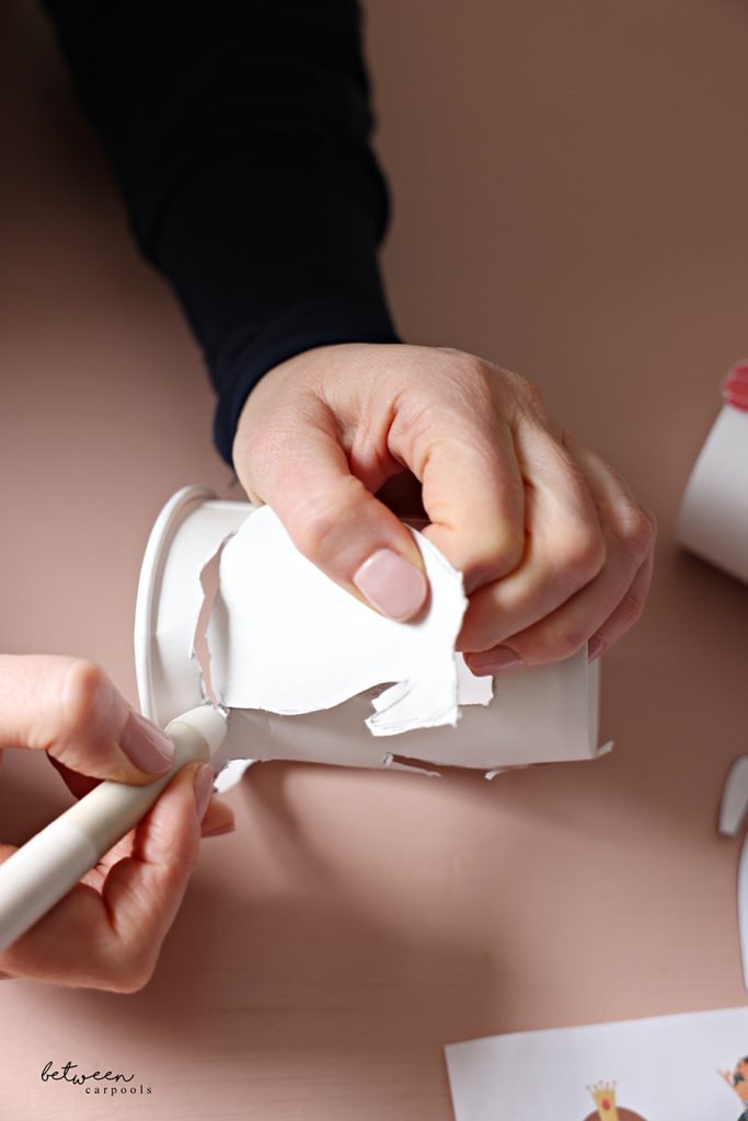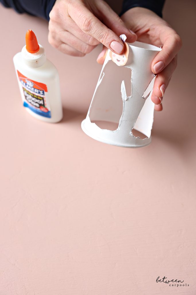 We used 12 oz. cups here, but the project can work with any size (if the cup is smaller, the head might stick out on top of the cup and that’s fine!) You’ll need two cups per project.