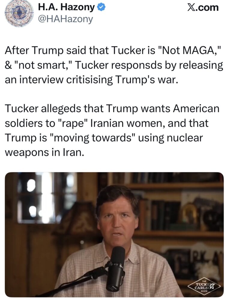 Political philosopher H.A. Hazony summarized the moment in a widely circulated post, writing that after Trump said Carlson is “not MAGA” and “not smart,” Carlson responded by releasing an interview criticizing Trump’s war policy and alleging that Trump wants American soldiers to “rape” Iranian women and is “moving towards” using nuclear weapons in Iran.