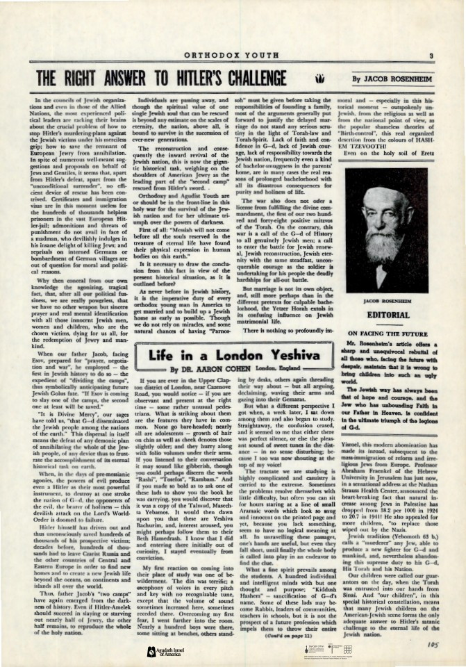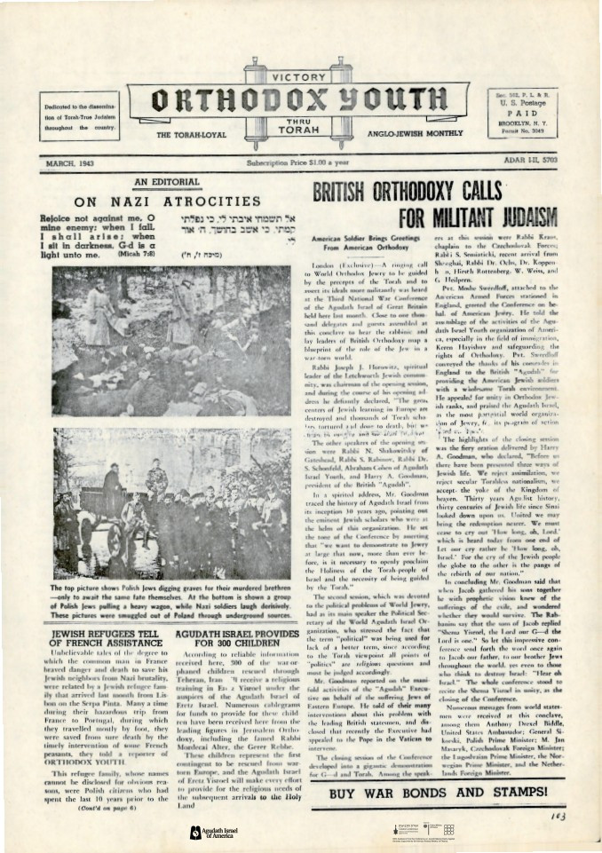 The first three collections are now up on the website. The first, Holocaust interviews, contains over 70 audio interviews with Holocaust survivors. The second and third collections feature two periodicals, Jewish Opinion and Orthodox Tribune (originally Orthodox Youth or Agudah Youth), which were published by Zeirei Agudath Israel of America in the 40’s, 50’s and 60’s. These publications, over 50 issues with hundreds of pages of news and articles, give a window into the progression of the war and its aftermath. For example, the Adar 1942 issue includes a front page with the headline “On Nazi Atrocities,” news about rescue and about Agudah’s efforts to help with religious education for children that were sent to the land of Israel, and an op-ed by Jacob (Moreinu Yaakov) Rosenheim, ”The Right Answer to Hitler’s Challenge.”