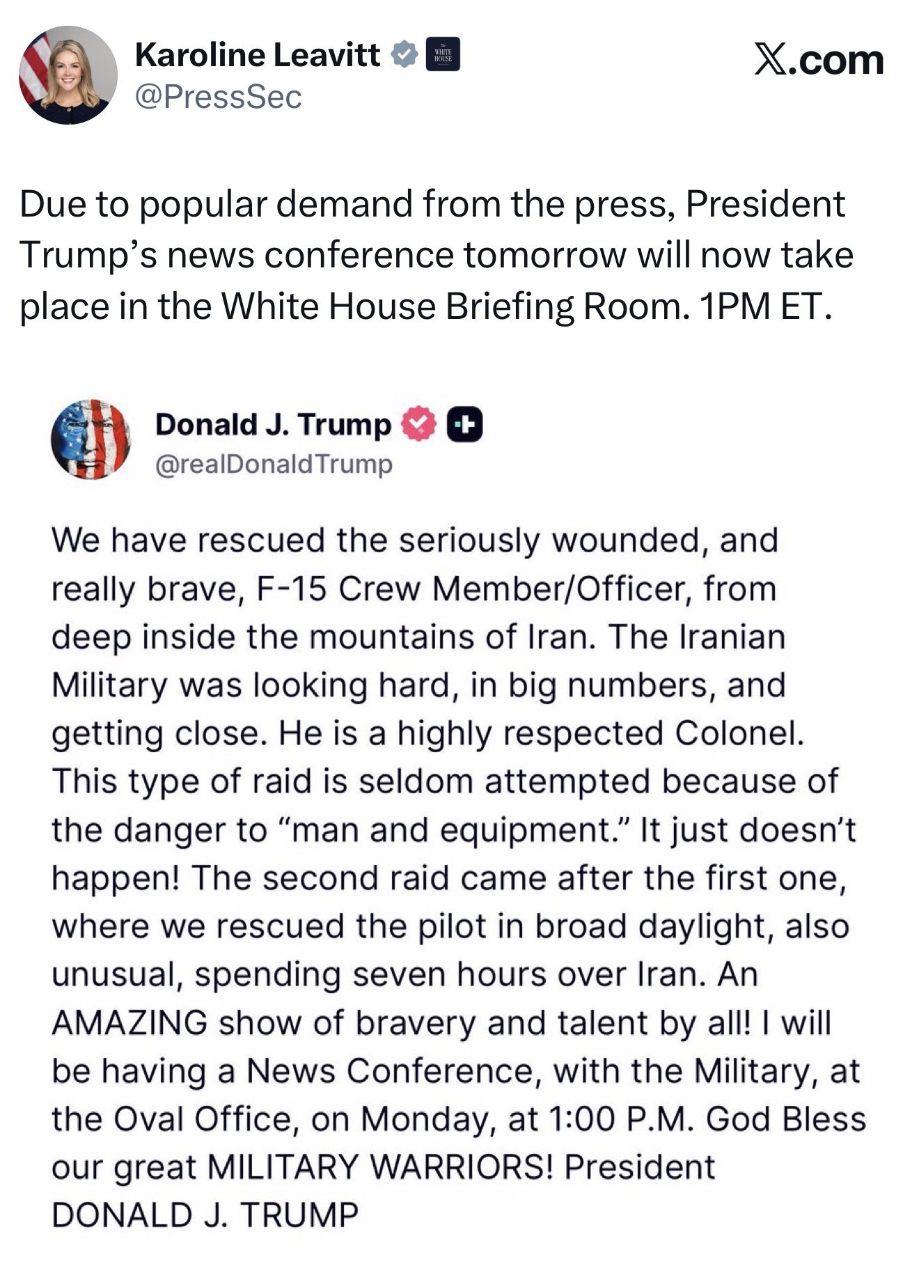 WASHINGTON D.C (VINnews) – President Donald Trump will hold a news conference on Iran in the White House Briefing Room at 1 p.m. ET Monday, accompanied by military officials, officials said.