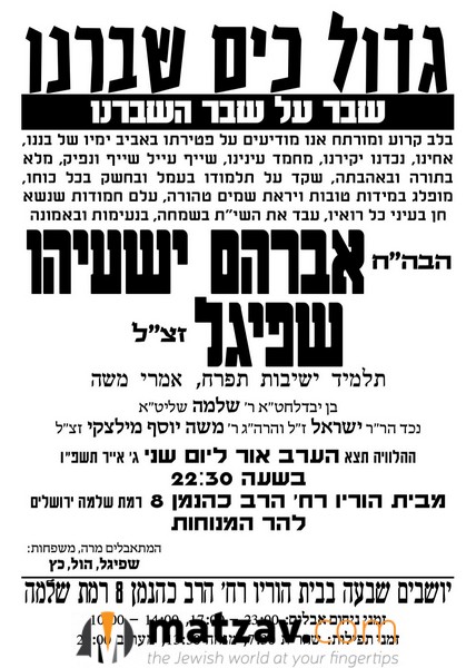 The levayah is scheduled for Sunday night at 10:30 p.m. from the family home at 8 Rechov Rav Kahaneman in the Ramat Shlomo neighborhood of Yerushalayim. Avraham Yeshaya will be laid to rest next to his brother in the Perushim section of Har Hamenuchos.