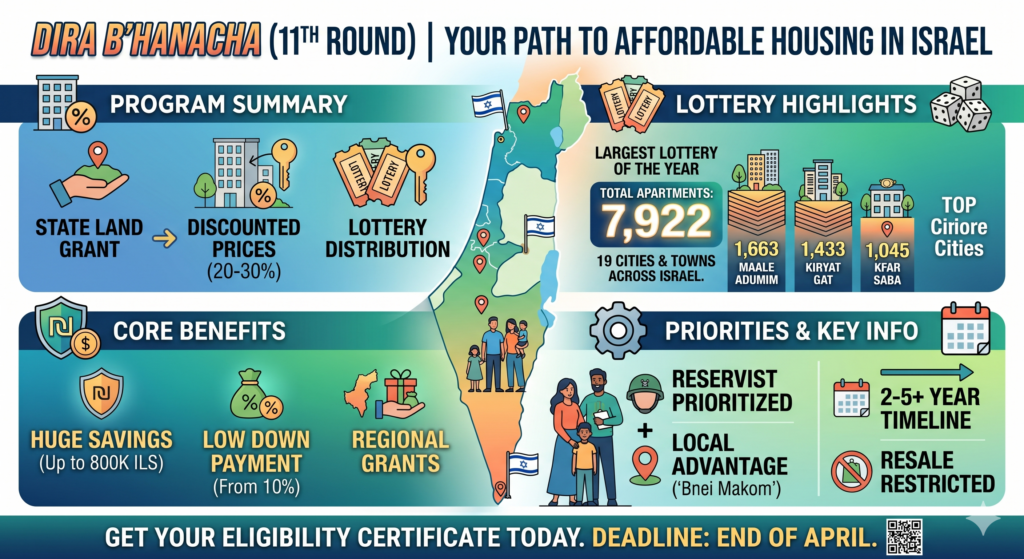 Registration is open to Israelis without an apartment who hold a valid eligibility certificate, which can still be issued online through the three authorized companies, Milgam, Alonim, and Me’of, until the end of April. Applicants can register in up to three different cities to maximize their odds, and demand is already overwhelming the portal, with site operators reporting heavy traffic since the lottery opened. With housing prices in Israel rising for a second straight month after the ceasefire and supply finally starting to catch up to years of pent-up demand, this round of Dira B’Hanacha may be one of the most consequential opportunities the market has produced in a long time.