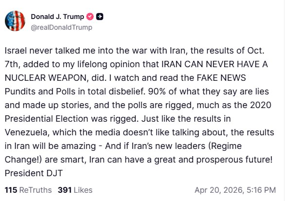 In the post, Trump said the events of Oct. 7 reinforced his “lifelong opinion” that Iran must be prevented from developing nuclear arms. He also sharply criticized news media, political analysts and polling, claiming that much of their reporting is inaccurate and that polls are “rigged.”