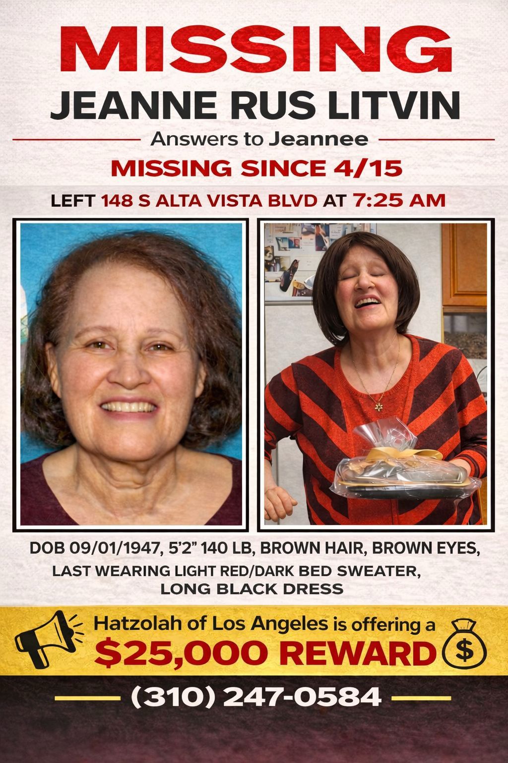 Litvin was last seen on the morning of April 15 at approximately 7:25 a.m. leaving her home in the Hancock Park neighborhood. Since then, there have been no confirmed sightings, prompting a large-scale, coordinated search involving multiple agencies and community groups.