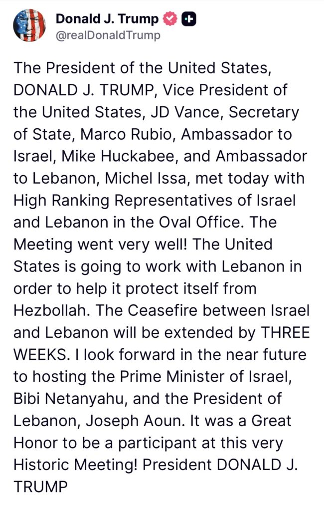 WASHINGTON — President of the United States Donald J. Trump announced following a high level Oval Office meeting that the ceasefire between Israel and Lebanon will be extended by three weeks, a move aimed at preventing further escalation along Israel’s volatile northern border.